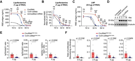 一系列的對比評估表明,與mRNA疫苗相比,circRNA疫苗具有以下特點(diǎn)或優(yōu)勢(圖3):1)circRNA具有更高的穩定性,可以在體內產(chǎn)生更高水平、更加持久的抗原;2)circRNA疫苗誘導機體產(chǎn)生的中和抗體比例更高,可以更有效地對抗病毒變異,降低疫苗潛在的抗體依賴(lài)增強癥(ADE)副作用;3)circRNA疫苗誘導產(chǎn)生的IgG2/IgG1的比例更高,表明其主要誘導產(chǎn)生Th1型保護性T細胞免疫反應,可以有效降低潛在的疫苗相關(guān)性呼吸道疾?。?/span>VAERD,Vaccine-associated enhanced respiratory diseases)副作用。