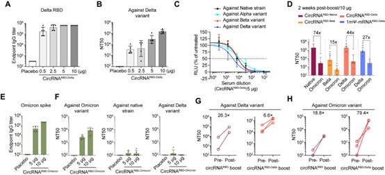 此外,在新冠病毒奧密克戎突變株被世界衛生組織列為值得關(guān)注的變異株(Variants of Concern,VOC)后,研究團隊緊急啟動(dòng)了針對該突變株的環(huán)狀RNA疫苗研發(fā)。在獲得病毒序列信息的30天內,完成了從疫苗生產(chǎn)、小鼠免疫到有效性評估的全流程。研究發(fā)現,基于奧密克戎變異株的環(huán)狀RNA疫苗(circRNARBD-Omicron)的保護范圍狹窄,其誘導產(chǎn)生的抗體只能夠中和奧密克戎變異株。而針對德?tīng)査儺愔暝O計的環(huán)狀RNA疫苗(circRNARBD-Delta)則可以在小鼠體內誘導產(chǎn)生廣譜的中和抗體,有效中和包括奧密克戎株在內的多種新冠變異株(圖4)。